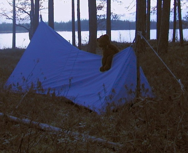 Nalle yritti auttaa teltan pystyttämisessä. Lähinnä se oli tiellä.